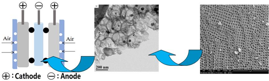 近日,谈球吧的易清风教授课题组报道了一种非贵金属的Ni-Co-N掺杂蜂窝碳纳米复合材料作为无膜直接醇燃料电池的阴极催化剂。该工作首先通过简单的PMMA模板法制备具有正六边形结构的蜂窝状碳,然后通过热解由蜂窝碳(HC),双氰胺和钴/镍盐组成的混合物,制备了NiCo掺杂的HC和C-N纳米空心管复合材料。以这种复合材料作为空气电极催化剂、碳纳米管负载的三元PdAgSn作为阳极催化剂,以乙醇,正丙醇和异丙醇为燃料,组装了无膜直接醇燃料电池。研究结果表明该阴极催化剂在碱性环境下具有优异的抗醇性,所组装的无膜直接醇燃料电池能以较长时间稳定放电。