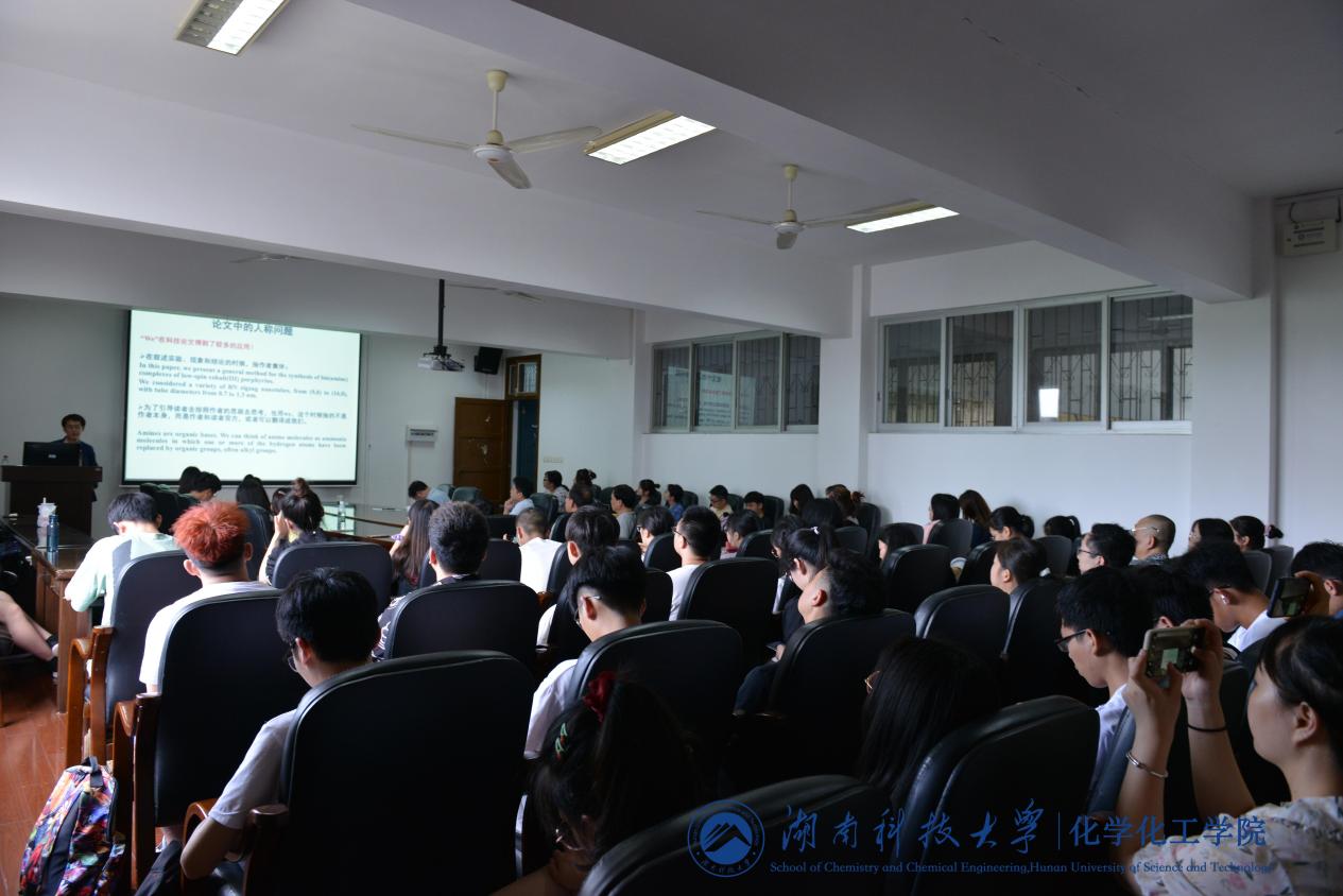报告会伊始,唐子龙教授对周震教授作了详细的介绍并对他的到来表示热烈欢迎。随后,周教授以他的第一篇英文论文作为切入点,阐明新形势下论文投稿期刊的选择、审核、修改及发表前后流程的注意事项。周教授从论文的定义出发,深入浅出地讲解如何判断一篇论文的好坏。紧接着,他对论文写作的词汇与语法要求进行一一讲解,并分析学术论文各部分内容的写作特点。报告会尾声,周教授向与会人员分享其独特的论文写作经验及技巧并对本场报告内容进行总结。
