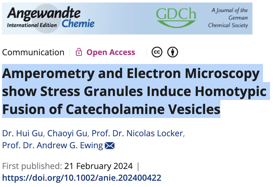近日,公司谈球吧教师谷慧副教授发现应激颗粒可促进同型囊泡融合。该研究成果以“Amperometry and Electron Microscopy show Stress Granules Induce Homotypic Fusion of Catecholamine Vesicles”为题发表在国际顶级期刊《Angew. Chem. Int. Ed.》上,该期刊为化学领域的经典Top期刊(影响因子:16.6)。该研究工作主要由谷慧副教授(第一作者)和哥德堡大学合作导师Andrew Ewing(通讯作者)共同完成,谈球吧网页版登录入口为第一单位。