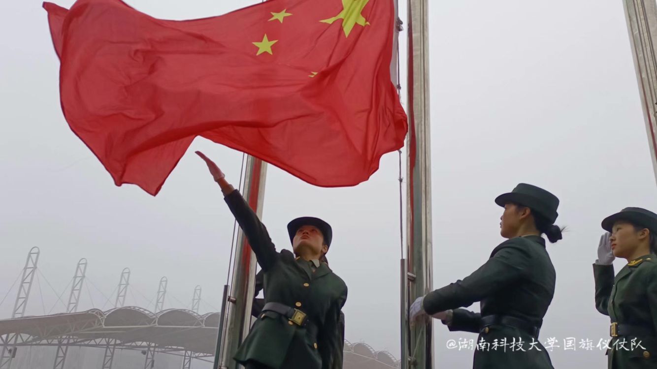 早上7:00,升旗仪式正式开始。仪仗队站在红色跑道上昂首挺胸,整装待发,在全场注目下,他们护送着鲜艳的五星红旗,铿锵有力的步伐,整齐划一的动作,坚毅果敢的目光,无一不向众人展示着,他们对国旗的热爱,对升旗的决心。随着主持人的一声:“升国旗,奏唱国歌!”国旗随风飘扬,缓慢升起,仪仗队全体成员挥臂敬礼,全体师生行注目礼。