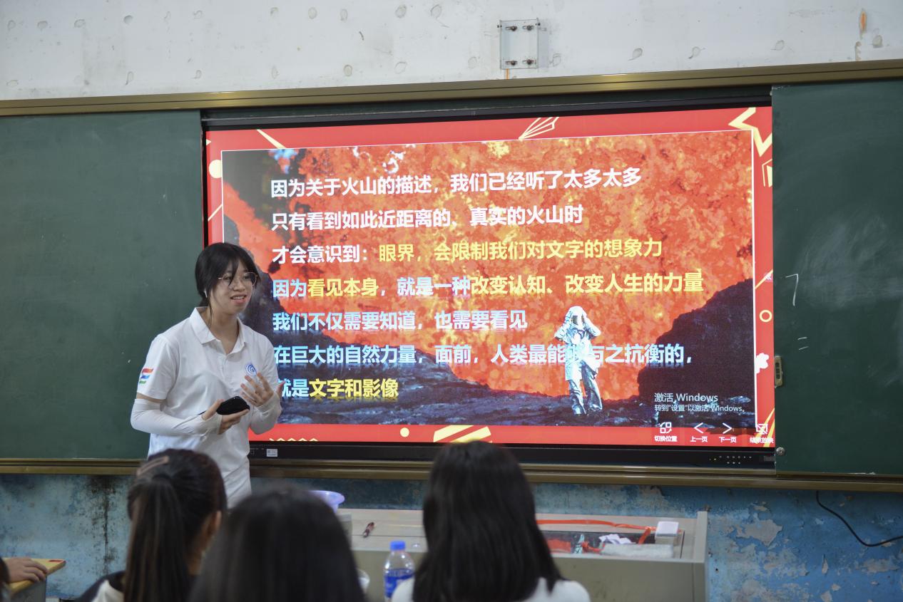 7月6日上午,志愿者为东堡中学的同学们开讲了一堂关于火山学家的文化科普课。课上,志愿者讲述了卡蒂亚和莫里斯相识相遇的故事,结合卡、莫二人的火山旅行视频展现了火山的神奇魅力。随后,志愿者重点讲述了两位火山学家探索圣海伦斯火山的惊险经历,以火山碎屑流的巨大毁灭力展示灰火山的特点,引导同学们深入了解灰火山。