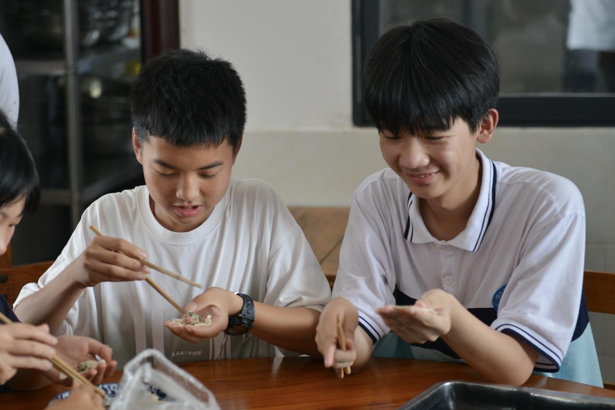 7月8日下午,志愿者组织东堡中学的同学们一起在食堂里包饺子。志愿者们预先准备好了饺子馅和饺子皮,和同学们一起沾水取馅儿,铁盘上出现了一个个形态各异的小饺子,有的像小鱼、有的像包子、有的像玫瑰花······沾上食堂叔叔特制的辣酱,同学们都吃得津津有味,意犹未尽。
