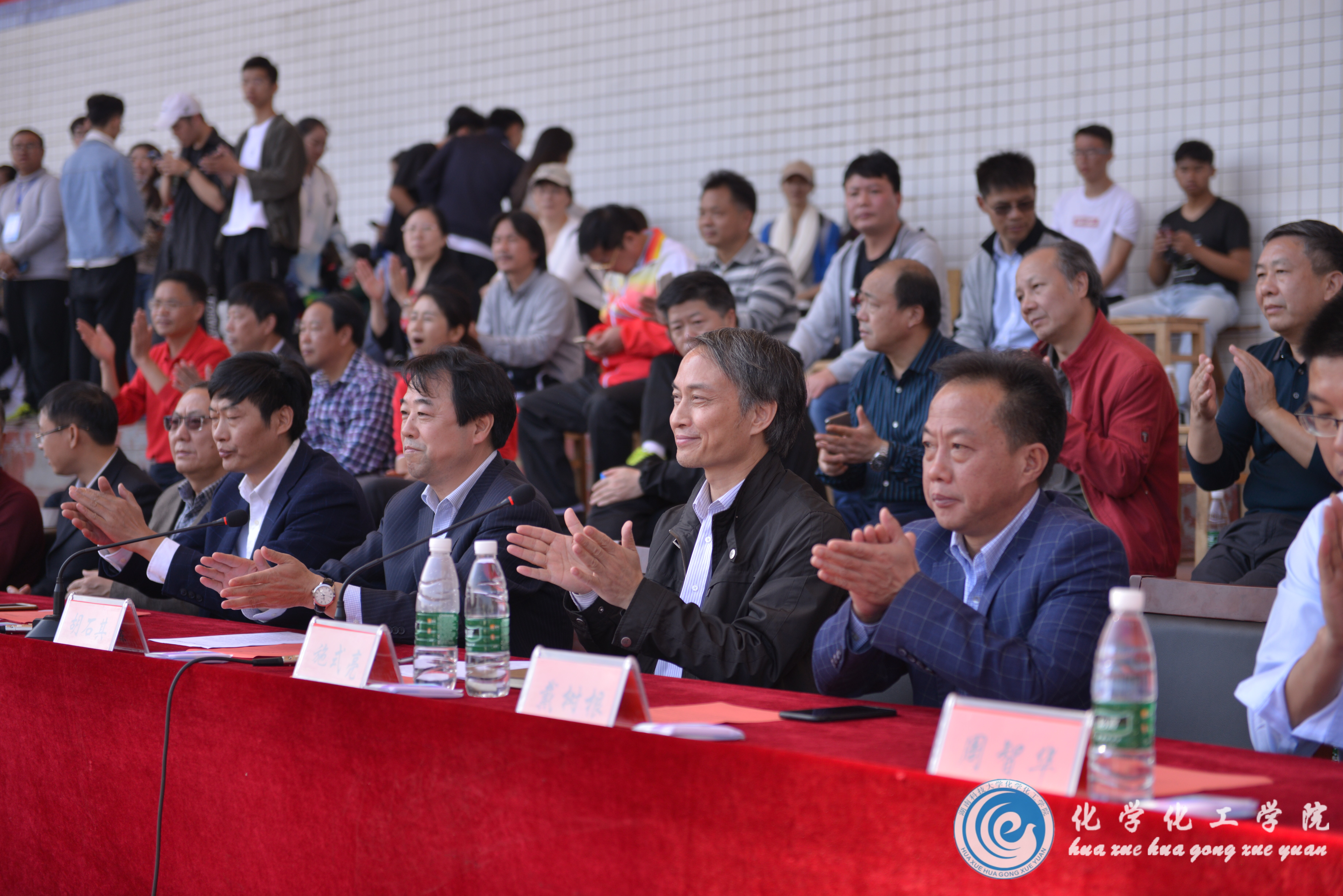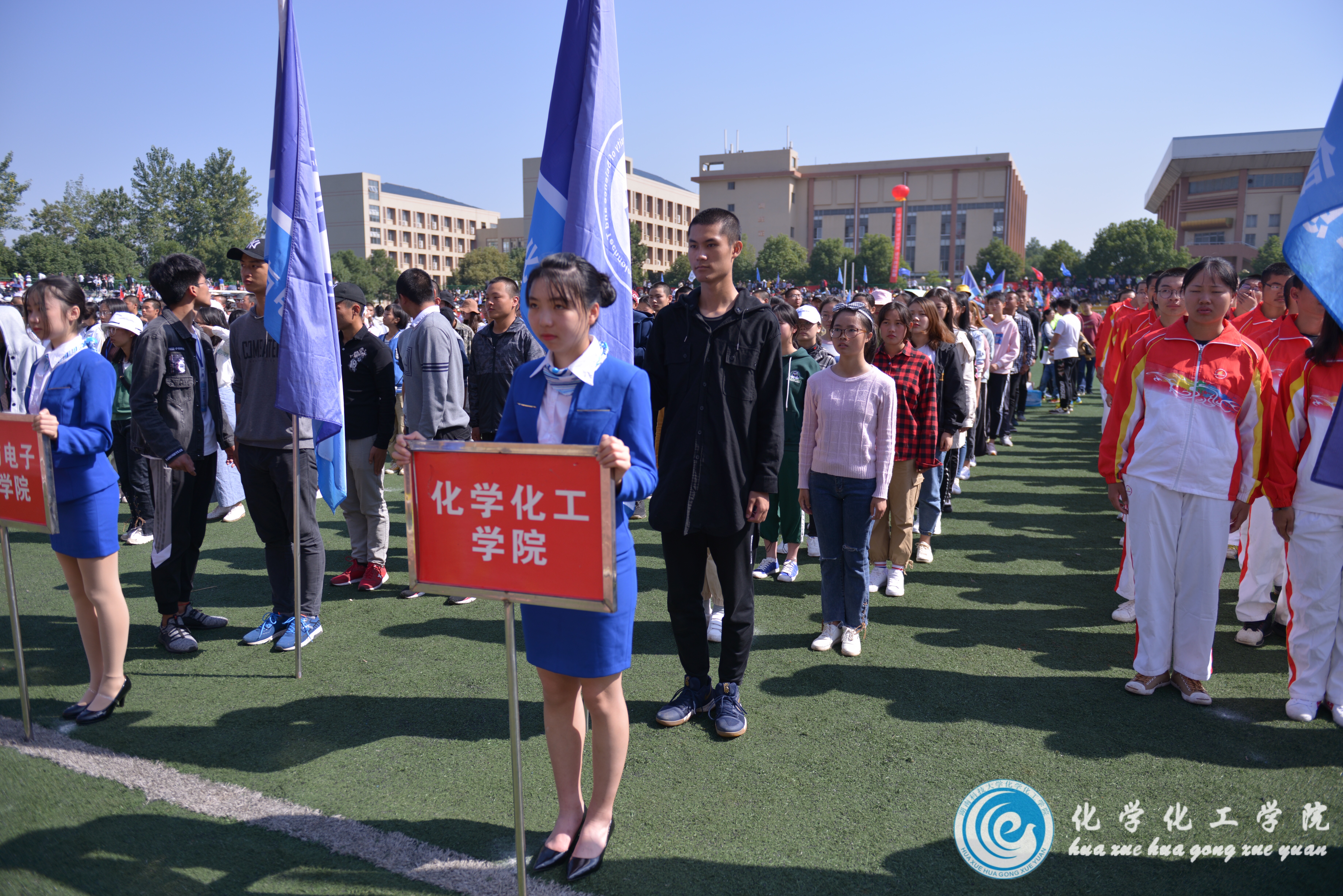 伴着雄壮的运动员进行曲,国旗班员工护卫校旗走进运动场,拉开本届运动会的帷幕。他们意气风发,斗志昂扬,展现了科大学子优良的精神风貌。紧接着,各院方阵队依次迈着铿锵有力的步伐、喊着高亢嘹亮的口号经过主席台,精神抖擞,气势磅礴。“科大化工,勇攀高峰,同心拼搏,树我雄风!”公司方阵队员英姿飒爽,意气风发;话语激扬,催人奋进。队列排成化学元素铜和锌,以示同心一致,别具一格的出场成为开幕式上一道绚丽的风景线。