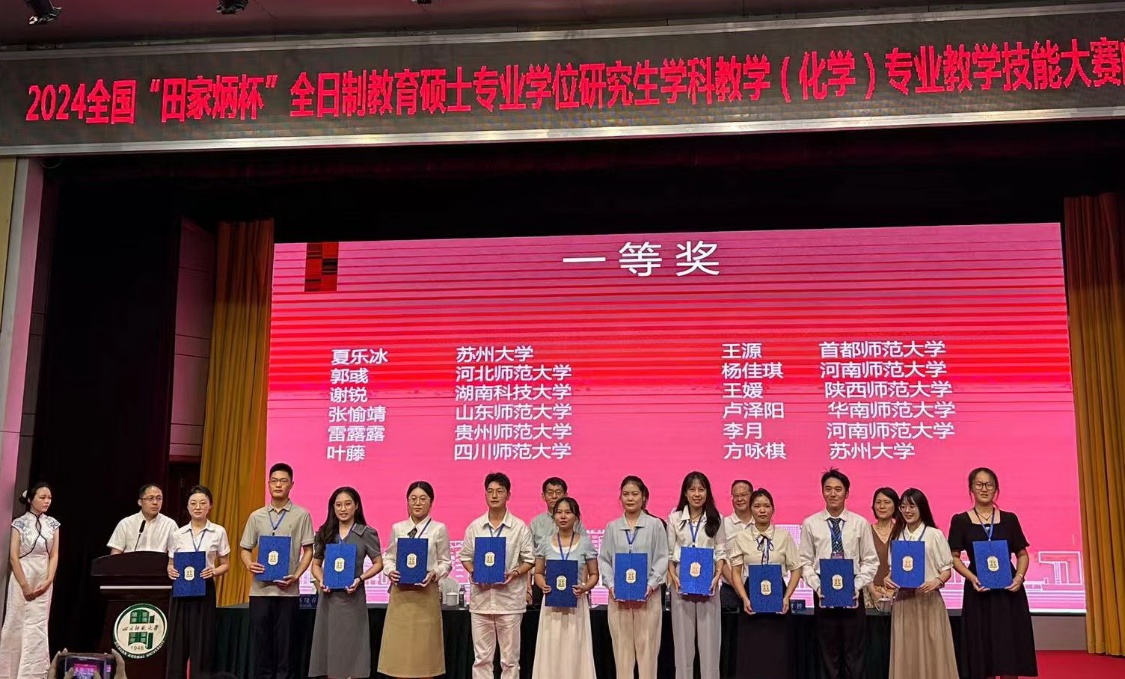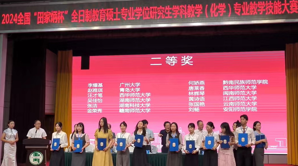 2024年9月8日,2024年全国“田家炳杯“全日制教育硕士学科教学(化学)专业学位研究生教学技能大赛在四川师范大学顺利落幕,谈球吧本次入围决赛的两名选手全部获奖。其中,2022级谢锐同学获得大赛一等奖、2023级张洁同学获得大赛二等奖。这是公司研究生参加该赛事以来的最高获奖也是获奖人数最多的一次。