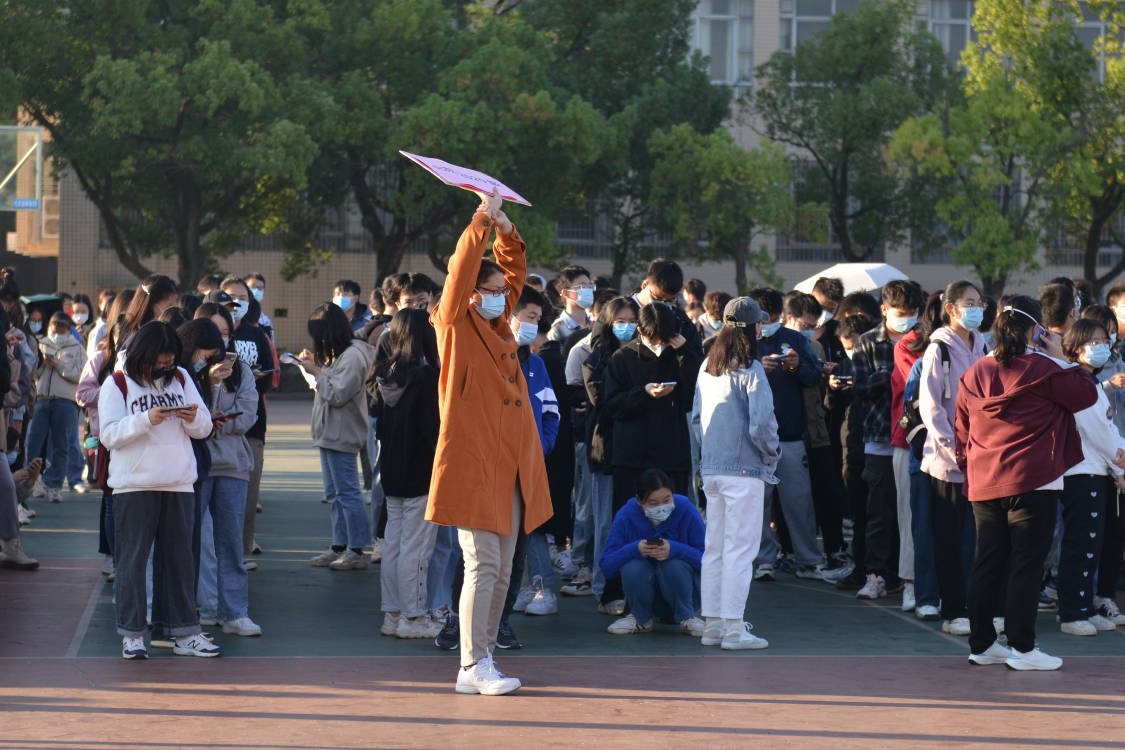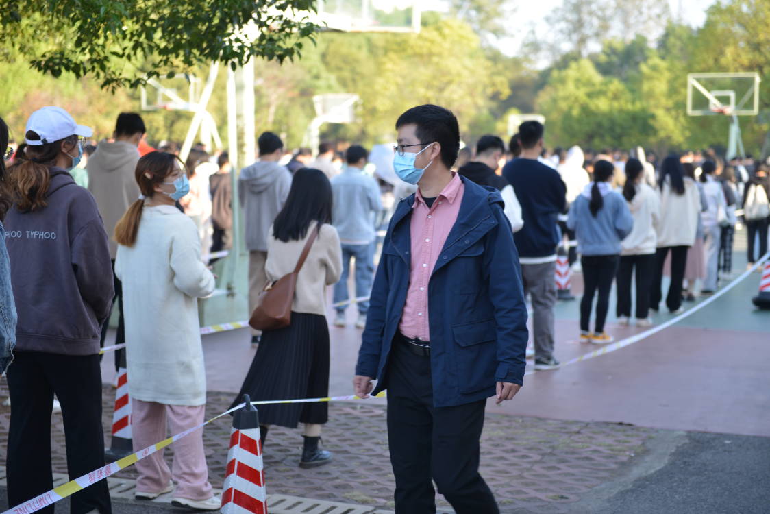 谈球吧22级辅导员曹文星老师在队列中组织引导员工