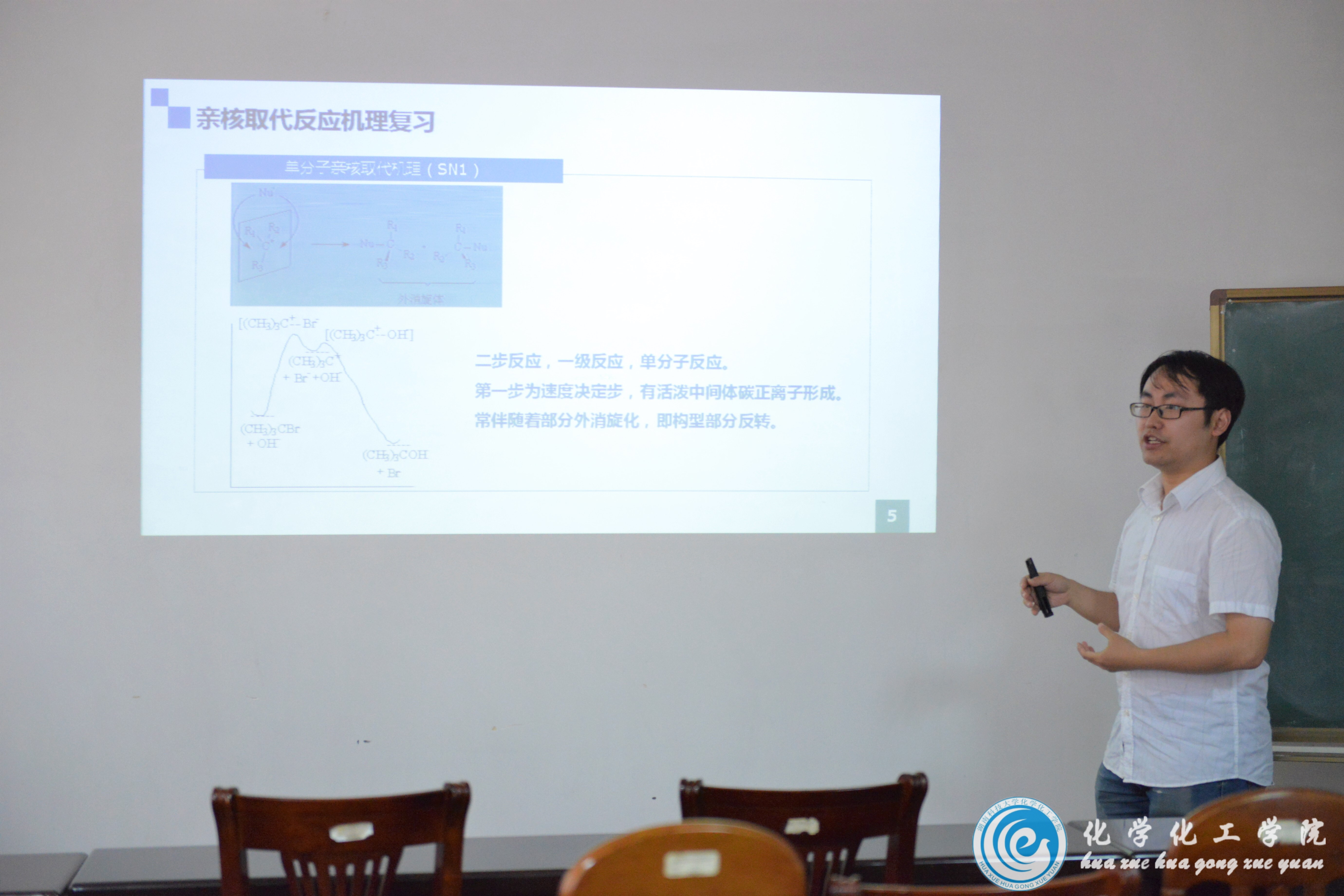 首先,刘玄老师和张少伟老师分别带来题为“卤代烃亲核取代反应”的有机化学课和“杂化轨道理论”的无机化学课。课堂中,他们仪态端庄大方,语言清楚流畅。接着,现场指导老师对其给予精彩点评,充分肯定两位教师的教学成功之处,同时也对不足之处提出建设性意见。其中,曹晨忠教授特别提出:教师应注意PPT背景颜色不宜过深,要突出课堂主要内容,注重对员工进行设问引导,使员工充分领会课堂教学内容。随后,校督导陶建军教授发表自己的看法,他说:“分析问题要简明,也要注意切入问题的角度,对于重要问题要着重强调,讲解时力求图文并茂。”