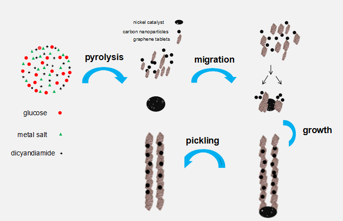 碳纳米管具有巨大的表面积和良好的导电性,越来越多地用于电化学催化和储能装置。由于氮掺杂剂与过渡金属物质的高亲和力,促进了氮掺杂碳和金属氧化物之间更强的耦合效应,这可以大大加速催化剂表面和反应中间体之间的界面电子转移。研究人员认为设计掺杂富电子氮的碳纳米管作为ORR电催化剂具有广泛的应用前景。合成氮掺杂碳纳米管(NCNT)的许多策略包括电弧放电,化学气相沉积和静电纺丝等,但它们涉及苛刻的条件而受到限制。因此,探索具有高效ORR电催化活性的氮掺杂碳纳米管的合成受到人们广泛关注。
