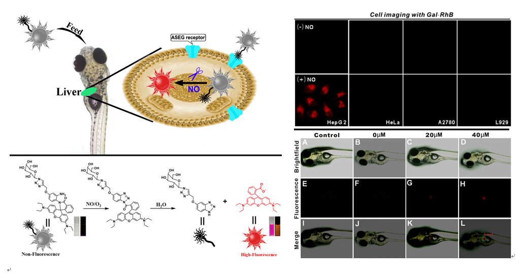 近日,谈球吧网页版登录入口理论有机化学与功能分子教育部重点实验室的张培盛博士研究团队首次报道了一种肝靶向NO荧光探针(Gal-RhB),实现了斑马鱼内肝脏中NO的原位成像检测。Gal-RhB以市售罗丹明B为母体结构,通过将邻苯二胺(NO识别基团)和半乳糖(肝靶向基团)引入罗丹明B结构中,构建了肝靶向NO荧光探针(Gal-RhB)。半乳糖基团的引入不仅增加了探针的水溶性,也有利于探针被肝细胞特异性摄取。细胞和活体成像研究表明:该荧光探针(Gal-RhB)能够被肝细胞特异性摄取,并应用于肝细胞和肝脏中NO的荧光成像分析。该研究对进一步了解NO与肝脏相关疾病的发生发展作用研究具有重要的意义。