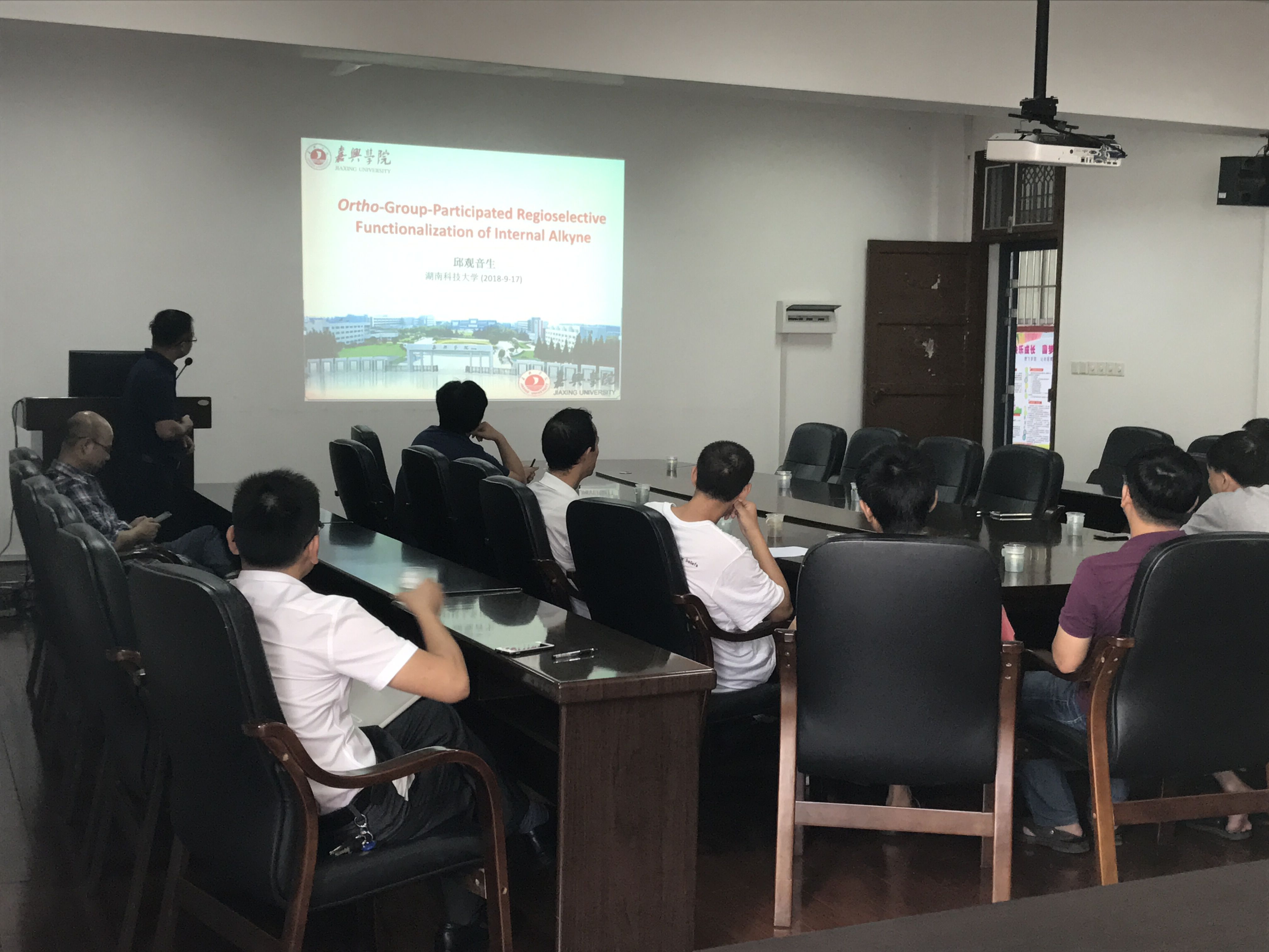 9月17日上午10点,应谈球吧和理论有机化学与功能分子教育部重点实验室的邀请,嘉兴公司邱观音生博士在化工楼三楼学术报告厅以“Ortho-Group-Participated Regioselective Functionalization of Internal Alkyne”为主题,做了一场精彩的学术报告。谈球吧师生、理论有机化学与功能分子教育部重点实验室全体科研人员等参加了报告会。此次报告会由公司郑柏树副经理主持。