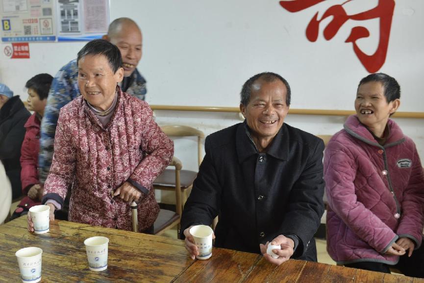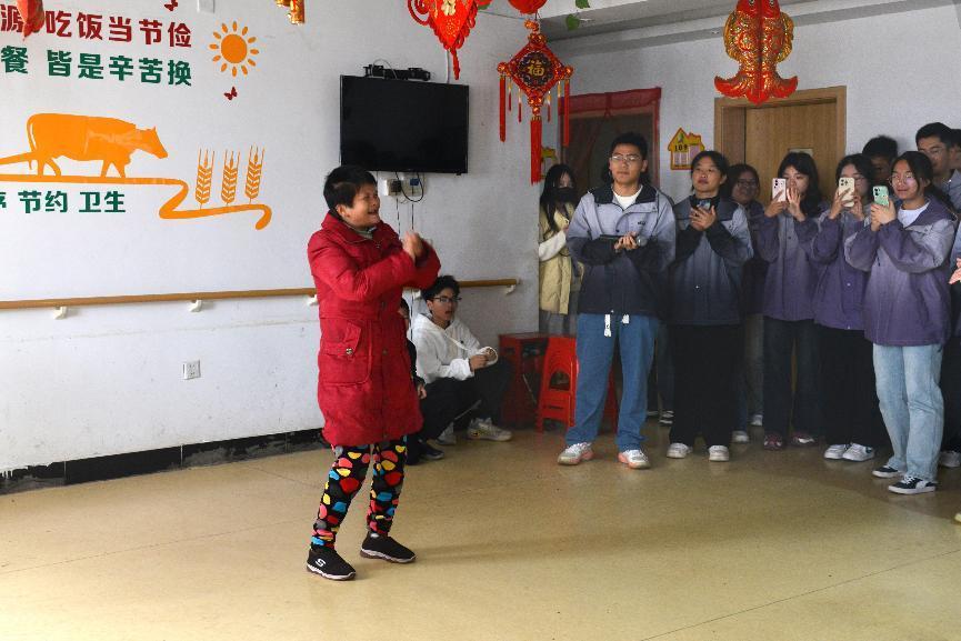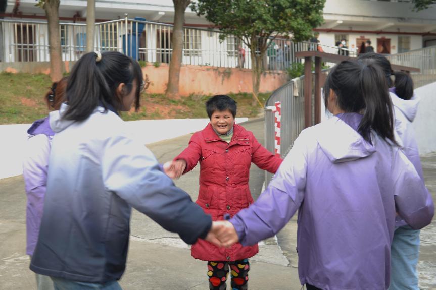 老奶奶唱完一首歌曲后,志愿者陪老人们一起玩游戏、聊天、唱歌、跳舞,房间里充满着欢声笑语,热闹非凡。