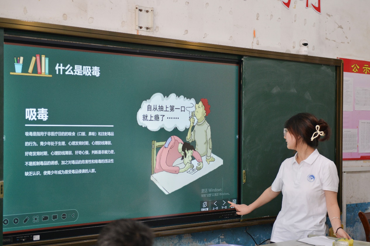 禁毒也是全社会共同的责任。无论用什么方式吸毒,对人体的肌体都会造成极大的损害,毒品对人的生理和心理都会造成巨大的损伤,破坏社会生产力,造成社会财富的损失和浪费。毒品活动扰乱社会治安,加剧诱发各种违法犯罪活动,给社会安定带来巨大威胁。随后,志愿者向同学们科普传统和新型毒品种类,从家庭和社会两方面为出发点,将真实案例和宣传视频相结合,联系日常生活实际,引导同学们讨论毒品的危害。