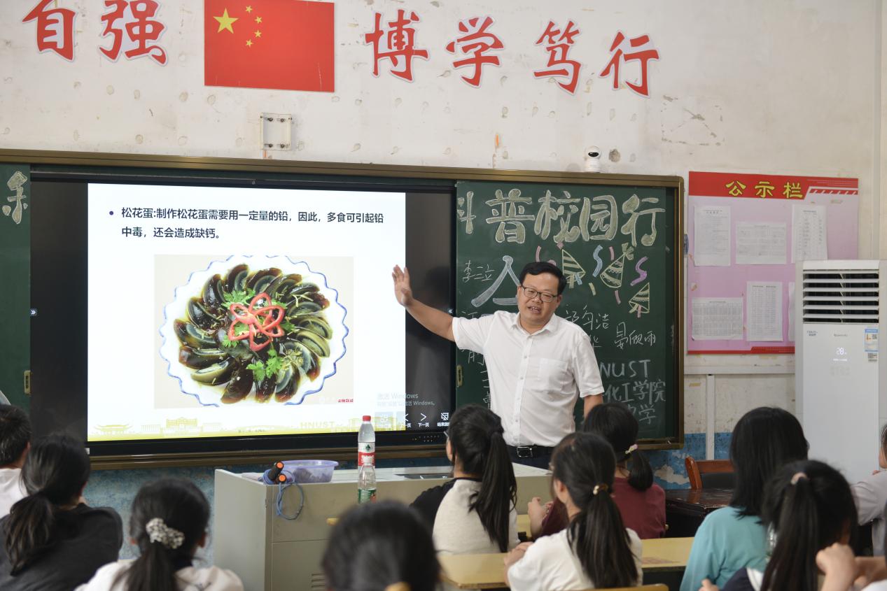 随后,他列举了盐、味精、松花蛋、臭豆腐、猪肝、鱼胆等例子,深入浅出地讲解各种食物的主要成分,还运用各种化学知识指出如何烧制菜品更有利身体健康,提醒同学们应少吃含铝、含铅的食物。